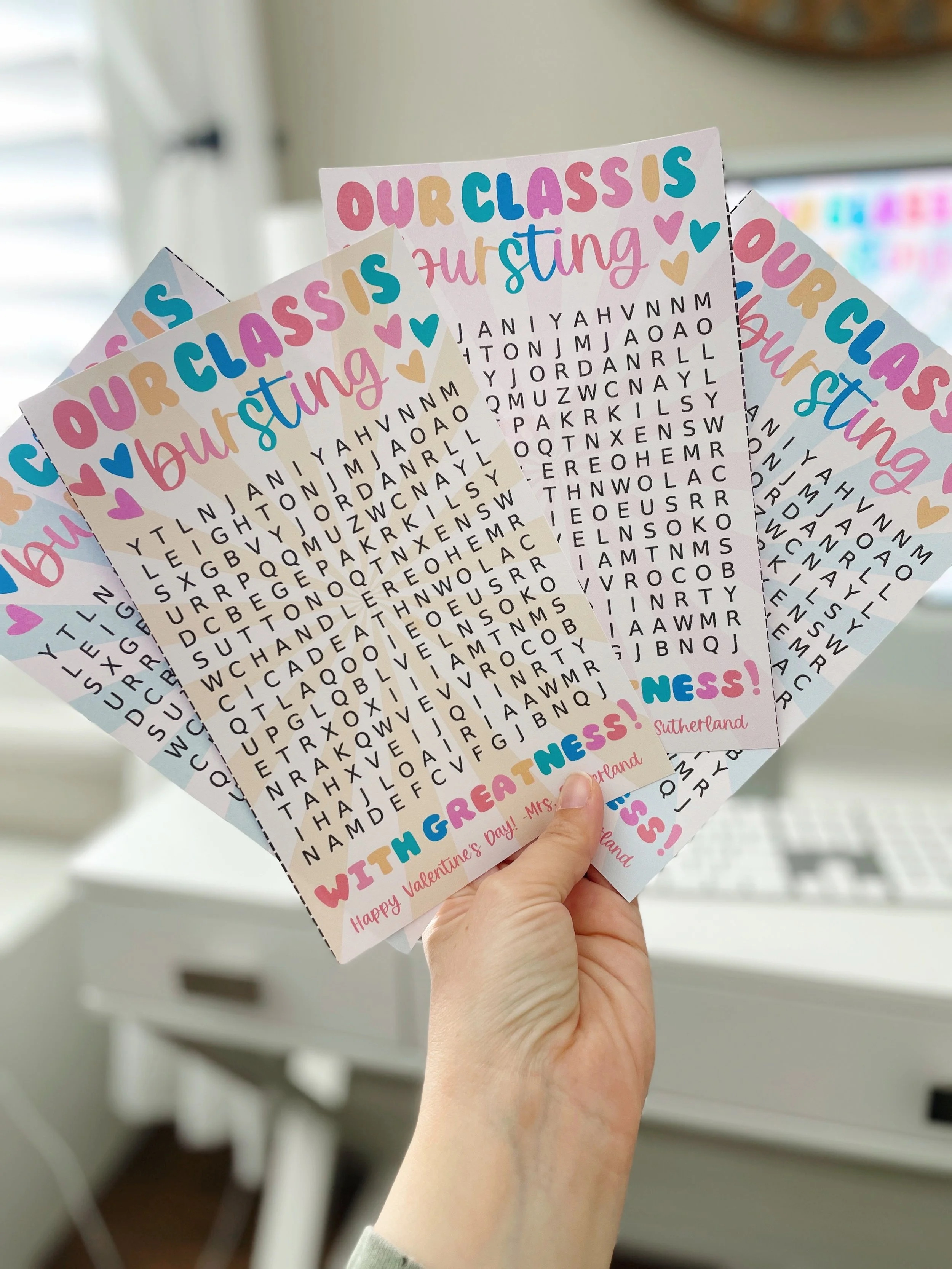 However, our district has moved away from emphasizing homework as much as they once did, so getting a homework pass is not as coveted as it was in years past. SO, I made these fun, easy word search Valentine Cards! These come with a word search with my entire class list right on the front…which was way easier to do than I thought it would be. You can easily snag these and customize them for your class if you want to do them for Valentine’s Day!